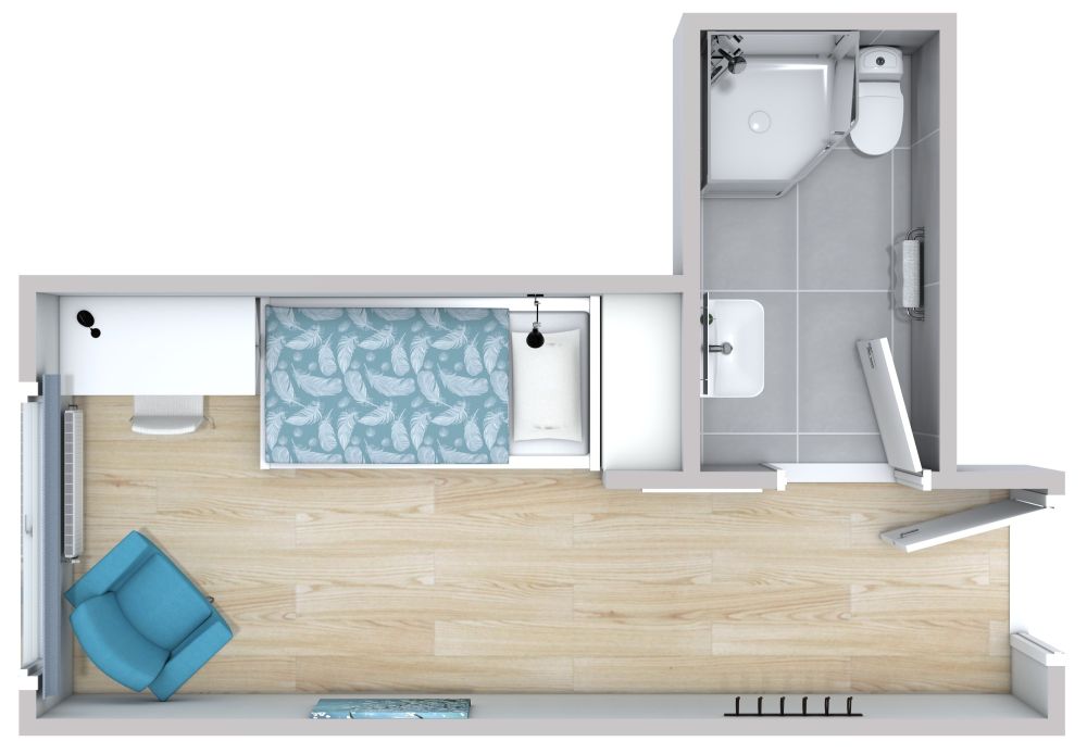A single traveler may not need much space, but they do require all the amenities of life. Fortunately, these can all be found in this single hotel room with turquoise blue accents, even though it's only 174 square feet. The room itself has blonde wood flooring, light blue walls, and white furniture, all of which give an impression of space. There's a single bed in one corner with shelves behind it for the traveler to unpack. There's an armchair in one corner, right beneath the window, where the traveler can read a book while enjoying the view. There's also a desk and chair in one corner in case they're on a business trip and need to get some work done. The bathroom has a shower, toilet, and sink, as well as a full-length mirror on the wall outside.