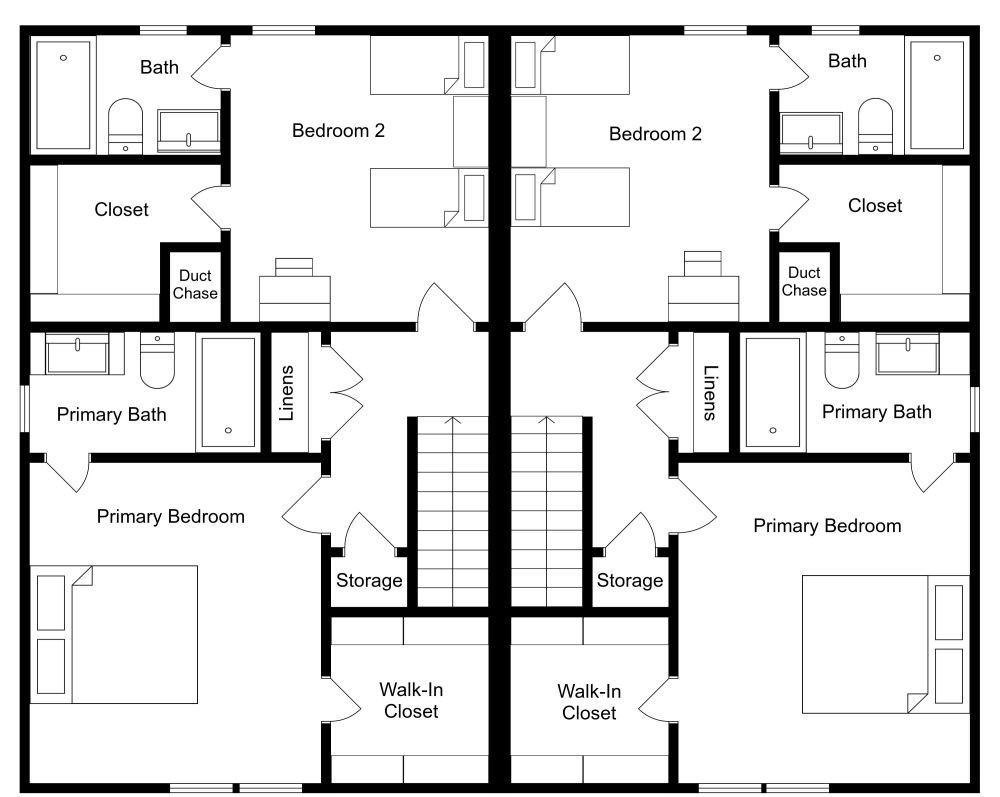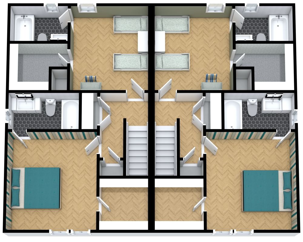 Modern, warm, and inviting, you'll love this duplex plan that doesn't waste an inch of space in terms of style and functionality. The ground floor of each side of the duplex includes a bedroom, a full bathroom, and a laundry room. The main living space features a kitchen that seamlessly flows into the dining area and living room, complete with a chic fireplace. One small porch can be found off of each side of the duplex with a larger shared porch connected to the two living rooms. The first floor features two more spacious bedrooms, two full bathrooms, a linen closet, and two large closets. Light wooden flooring arranged in a chevron design along with dark moody walls give these two homes a cozy yet contemporary ambiance.