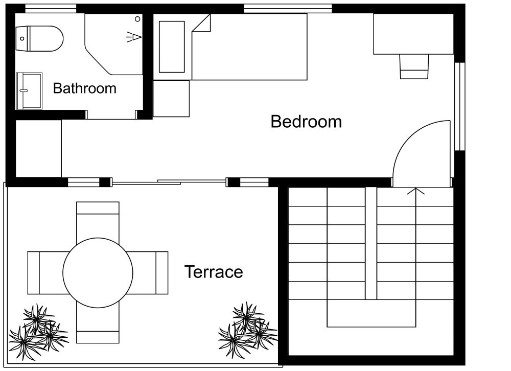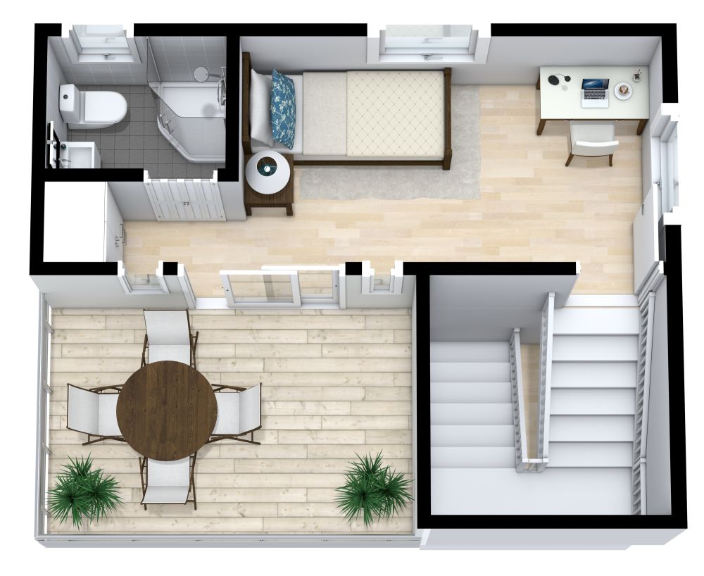 There are many advantages of living in a container home, such as the fact that they are compact and more energy efficient, both of which are important for students living on a budget. This 2 story container home for students makes the best use of the available space. It contains three single bedrooms, each of which has a twin bed, a closet, a desk and a chair. It also has three bathrooms, each of which has a corner shower, a toilet and a sink. The living room has a cream, L-shaped sofa with a coffee table and the dining area has a small table with four chairs. There's a small kitchen with a cooking range, a sink and a refrigerator. There are also two patios on the two levels, each with a table and four chairs. Overall, this is a bright, compact, convenient home for students.