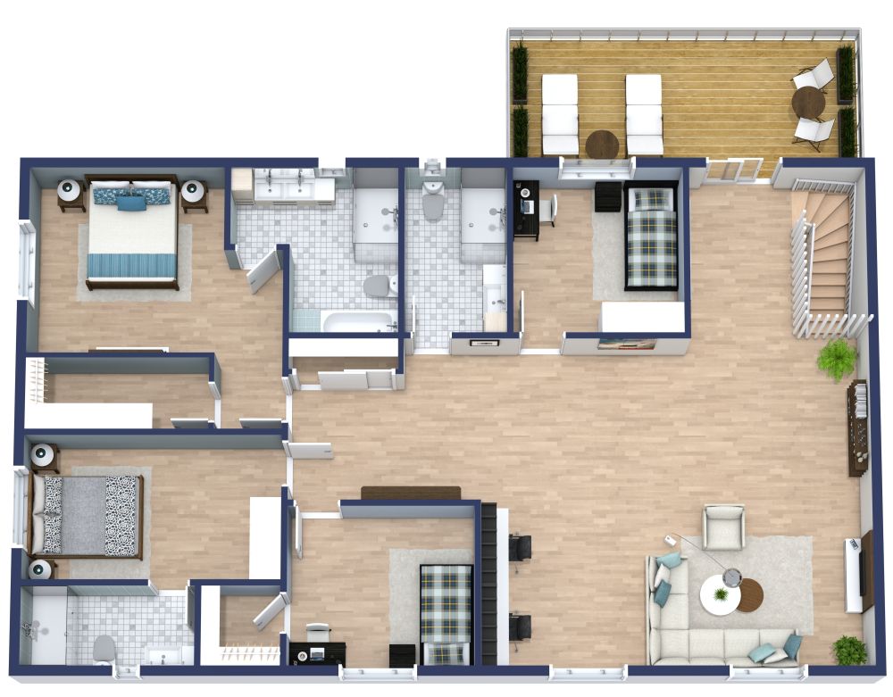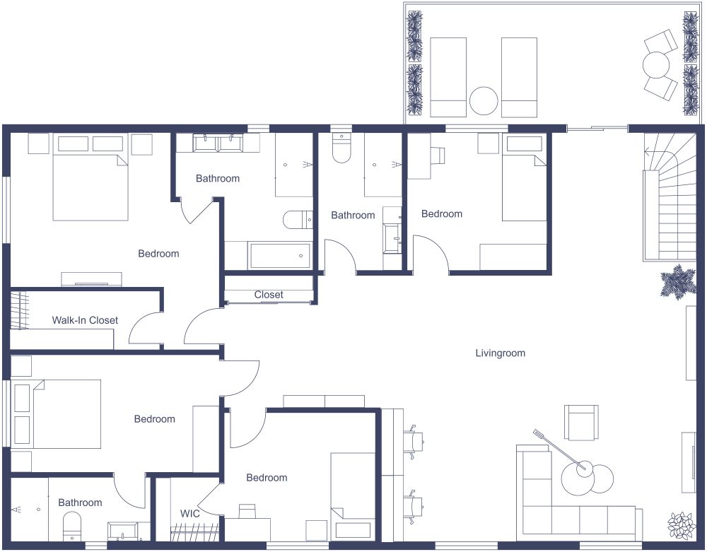What a delightful two-story, 3,500 sq ft floor plan! The spacious living and dining room is complemented by a beautiful kitchen featuring worktops and cabinetry on three sides, a center island/breakfast bar, and a butler's pantry. Enhancing the living design, both front and rear patios offer ample space for outdoor enjoyment, entertaining, and dining. Access to the rear deck is through a mudroom equipped with a sink, worktop, cabinets, and a large storage closet. The great room leads to two bedrooms, each with an en-suite bathroom; one also includes a walk-in closet. On the other side of the great room is a versatile room with a tiled area and storeroom, plus direct access to the rear patio. A convenient half-bathroom is adjacent to the stairs leading up to another beautifully designed living area. The second floor features a lovely living room, four bedrooms, and a guest bathroom. Two of these bedrooms have en-suite bathrooms, with both this bedroom and bedroom #3 offering walk-in closets. To top it off, there’s an enclosed deck.