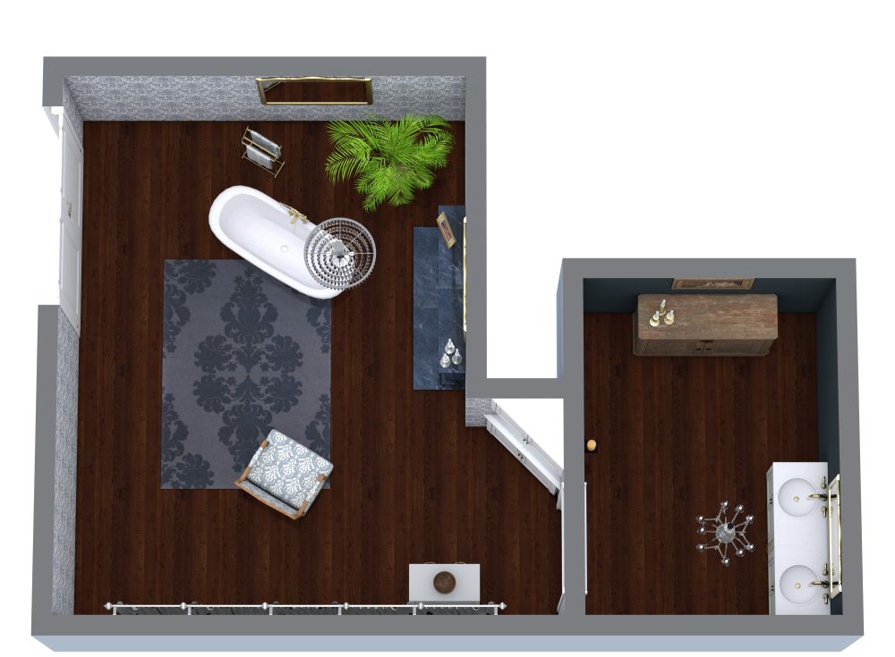 There's nothing ordinary or expected about this Victorian-style bathroom, which is as dramatic and elegant as it is cozy and comfortable. French doors lead into a spacious area adorned with rich, dark flooring and sophisticated wallpaper. A panel of windows lines one wall, complete with flowing curtain panels. The bathtub, positioned in the center of the room, serves as the focal point. An accent chair, area rug, and fireplace create the perfect atmosphere for pampering. In the corner of the room, a dresser provides convenient storage space. Tucked away in another corner is a small separate room featuring a pair of sinks, a rustic dresser, and an eye-catching chandelier hanging from the ceiling. You'll look forward to spending time in this cozy, one-of-a-kind bathroom.