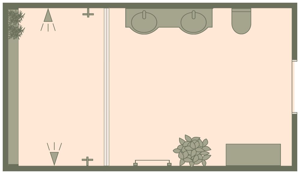 Understated elegance and undeniable style reign supreme in this black and white modern bathroom. The room feels spacious and open with a black toilet and matching pair of sinks on one side of the doorway and a small black cabinet and towel rack on the other. The main bathroom is connected to an oversized walk-in shower that's separated by wall-to-wall glass and a glass sliding door. The stunning shower includes two shower heads and a stone ledge that runs from side to side. Both the shower and bathroom are adorned with speckled black, white, and grey tile flooring as well as modern stone walls. A few indoor plants add a pop of greenery and complete the uncomplicated yet elegant style of this eye-catching, contemporary bathroom.