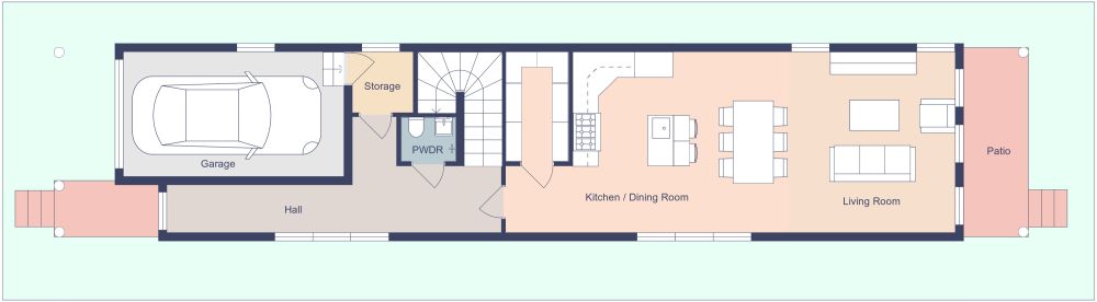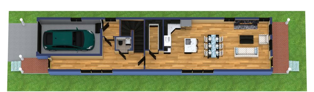 With three bedrooms spread out over two floors and over 1,500 square feet of space, this camelback shotgun house plan provides plenty of space for any growing family. Upon stepping into this home from the attached one-car garage, the first thing you'll notice is the warm homey feel courtesy of the oak-colored hardwood floors that continue throughout the home. On the spacious, open-concept ground floor, you will find a powder room, a large kitchen with a walk-in pantry, an island with bar seating, space for a large dining table, and a cozy living space complete with a fireplace. Moving upstairs, you'll find the living spaces, including a spacious primary bedroom with a large closet and dressing area, as well as an en-suite bathroom with tile floors and a luxurious soaking tub. Rounding out this floor are a laundry room, nursery, and two additional bedrooms with a Jack and Jill bathroom.