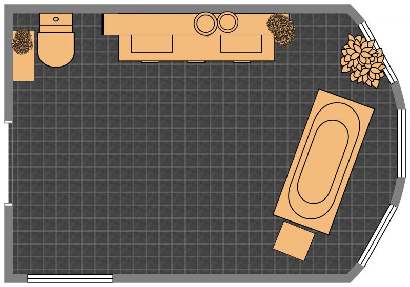 This dark rustic bathroom transforms a typical bathroom into a luxurious sanctuary. Dark tiled flooring sets a dramatic, calming backdrop, while special wall-mounted lighting and a chandelier cast a soft, soothing glow throughout the space. The freestanding bathtub sits in a wooden surround within the bay window area, creating a focal point. A small table and cabinetry beside the tub provide perfect spots for displaying scents, perfumes, and candles. One long wall features a corner commode followed by two elegantly designed square washbasins. Each basin comes with its own cabinetry, offering generous counter space and a wall-mounted cabinet with excellent lighting. The opposite long wall remains open, ready for artwork or additional furniture. This layout ensures the bathroom feels spacious and adaptable. With its thoughtful design and atmospheric lighting, this rustic bathroom offers more than just functionality—it's a serene escape designed for complete relaxation.