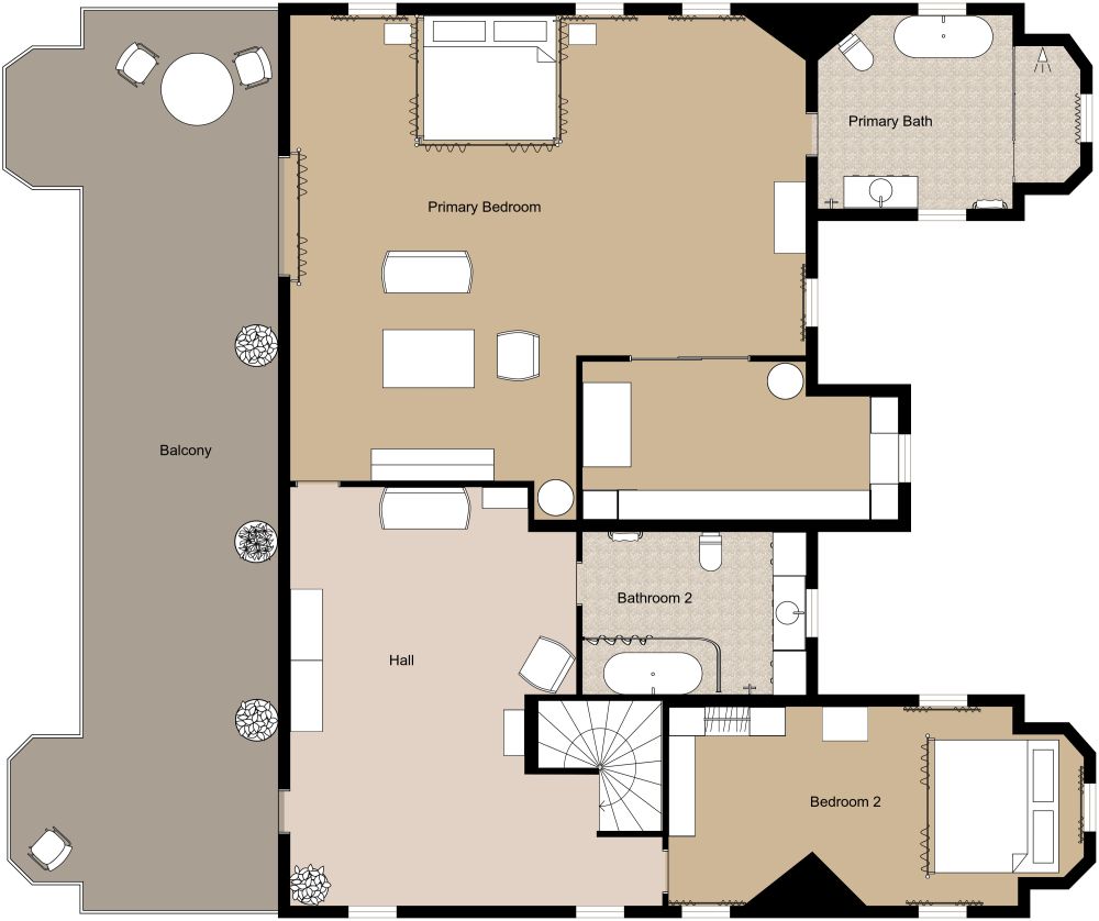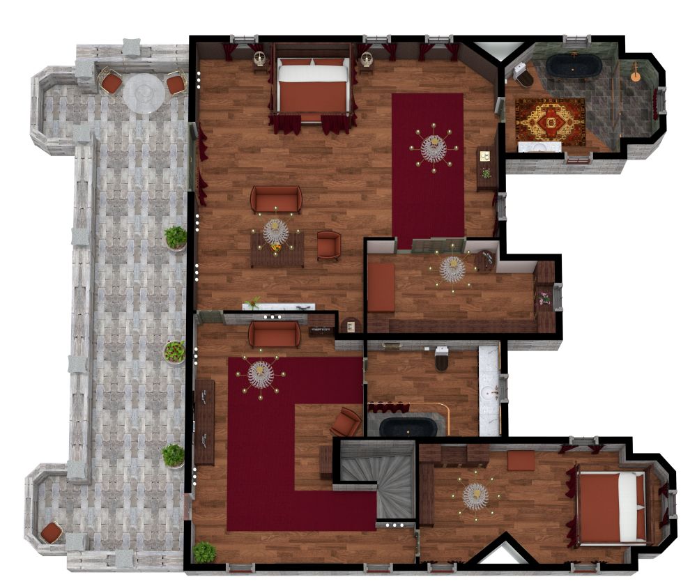 Who wouldn't want to feel like royalty every time they spend time in their home? With this one-of-a-kind castle floor plan, you will truly be the king or queen of your residence. The two-story floor plan includes a dramatic entryway and courtyard, an extensive hallway, an open-concept kitchen and dining room, a pantry, a bathroom, and a guest room on the first floor. A winding staircase leads to that second floor that features a sprawling primary bedroom, an additional spare bedroom, and two more bathrooms. A large second-story balcony spreads from one side of the castle to the other adorned in traditional, gray stone. Rich, handsome hardwood flooring can be found throughout the home as well as dark, moody walls, giving each room a sophisticated, dramatic ambiance. Eye-catching chandeliers illuminate every room of the castle while deep red rugs add a pop of color to the otherwise bare floors.