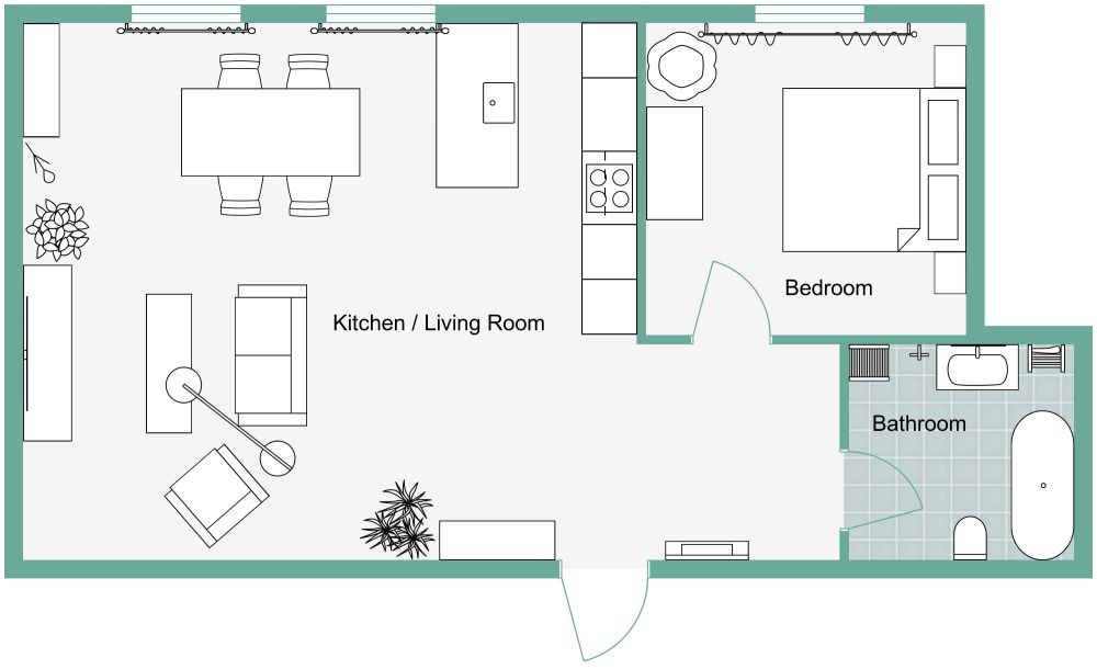 This one-bedroom condo is perfect for a single person or a couple. Walking in, you’ll notice the open layout, light wood floors, and big windows that make the space feel bright and comfortable. The living room takes up about one-third of the space. Next to it is the dining area, with two tall windows letting in lots of natural light. The kitchen has plenty of counter space and cabinets. A separate sink area and breakfast bar create a nice division between the kitchen and dining space. About three-quarters of the condo is dedicated to the living area, giving it a cozy, homey feel. The bedroom easily fits a large bed and has a tall window, making it bright and perfect for relaxing, reading, or studying. The bathroom is right next to the bedroom and is easy to access from the living area.