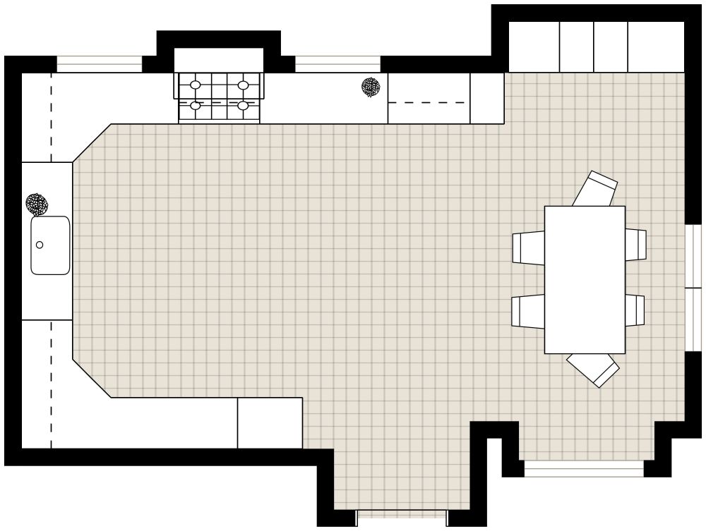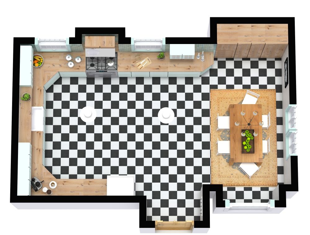 A touch of whimsy can be found in this eat-in u-shaped kitchen with mint green cabinets. The combination of bold flooring, pastel green cabinets and four large windows will make you want to be active and experimental in this space, which is a plus for culinary enthusiasts. Additionally, the U-shaped kitchen has plenty of counter space, a range, a sink and a number of cabinets; this makes it perfect for the preparation of any delicacy you have in mind. The large dining area which can seat up to six people is flanked by two windows, so you can get your daily dose of vitamin D along with your meal. There's also room for a shelving unit with doors in one corner for extra storage. Overall, you'll love cooking, eating and spending time with your family and friends in this space.