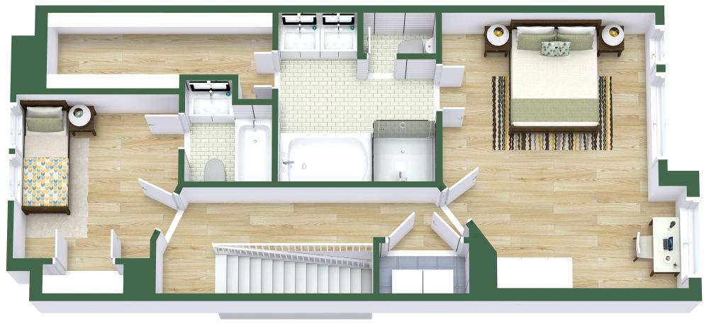 Designed for luxurious features in a small footprint, this floor plan with a large kitchen and 2 car garage spreads across 3 stories, with 3 bedrooms and 3.5 baths. On the ground floor, enter through the front entry or via the 2 car garage. If you like to host guests or in-laws, you’ll appreciate the convenient en-suite bedroom on this ground level, complete with a walk-in closet and full bathroom. Upstairs, enjoy open plan living with a cozy fireplace, large windows overlooking the yard, and a private deck. Notice the spacious G-shaped peninsula kitchen, which offers plenty of room for cooking and entertaining. The customizable kitchen includes a range, double sink, full-size refrigerator, large pantry, and lots of counter space. A separate dining space is adjacent, and a handy powder bath is also nearby. The top floor features a sizable primary bedroom, with a huge walk-in closet and spacious bathroom, complete with double sinks, a private toilet area, and a separate shower and bathtub. A secondary bedroom on this level also includes an en-suite bathroom. Near the bedrooms, notice the convenient laundry area.