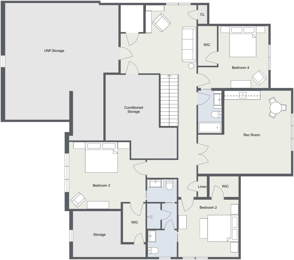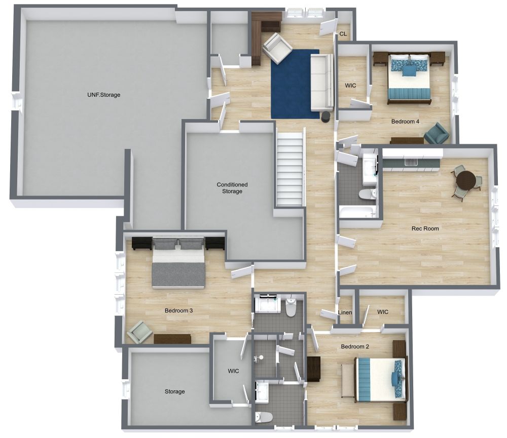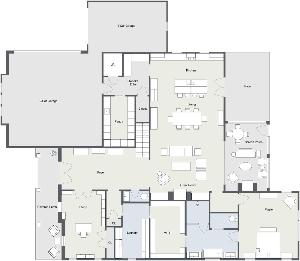 With a coveted downstairs primary bedroom and spacious floor plan, this 2 level 4 bedroom home with a 3 car garage gives your family room to spread out. From a covered front porch, dramatic double doors lead into a spacious entry foyer, complete with a private study, powder bath, and storage options. An open concept great room is perfect for the chef who wants to be part of the action; the high-end kitchen includes a large island/breakfast bar overlooking the dining and living area. An enormous pantry provides storage space and the ability to hide some of the cooking prep. A nearby screened porch is a lovely spot for entertaining and enjoying the view. The primary bedroom suite features a spa-like ensuite bathroom with a private toilet room, large shower, dual sinks, and a soaking tub. Plus, the vast walk-in closet has direct and convenient access to the downstairs laundry room. Upstairs, each secondary bedroom includes direct access to a shared bathroom. A rec room and open loft area provide many furnishing possibilities - imagine a reading nook, gym, teen room, or playroom - whatever fits your family and lifestyle.