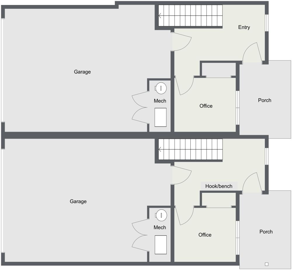This 3 story duplex floor plan shows various layouts for the same basic footprint: one unit offers a living room with soaring ceilings and 2 bedrooms, while the other duplex offers a 3rd bedroom above the living room. Each duplex’s ground floor features the exact layout - a front porch, entry foyer/drop zone, home office, mechanical room, and garage. The middle floor of one unit includes a coat closet at the top of the stairs, a split kitchen layout with the pantry across the hallway, and an expansive kitchen island. The living room in this layout features soaring ceilings up to the roof.