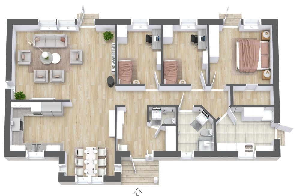 If you prefer a private kitchen and dining area separate from your living room, explore this Smultronstallet 129 layout. The spacious entrance foyer, styled with a coat closet plus a handy chair and shelves, creates a perfect drop zone for shoes and other accessories. Nearby, you’ll find a convenient powder bath. The lovely large living room has windows and a glass door to access the backyard. Chefs will enjoy the adjacent U-shaped kitchen, which puts all your favorite appliances within reach. A bright, light-filled dining area with windows on 3 sides allows you and your guests to enjoy the view. You’ll find 2 secondary bedrooms and a spacious primary bedroom with a walk-in closet and outdoor access down the hall: a nearby customizable full or ¾ bathroom and large laundry room complete this layout.
