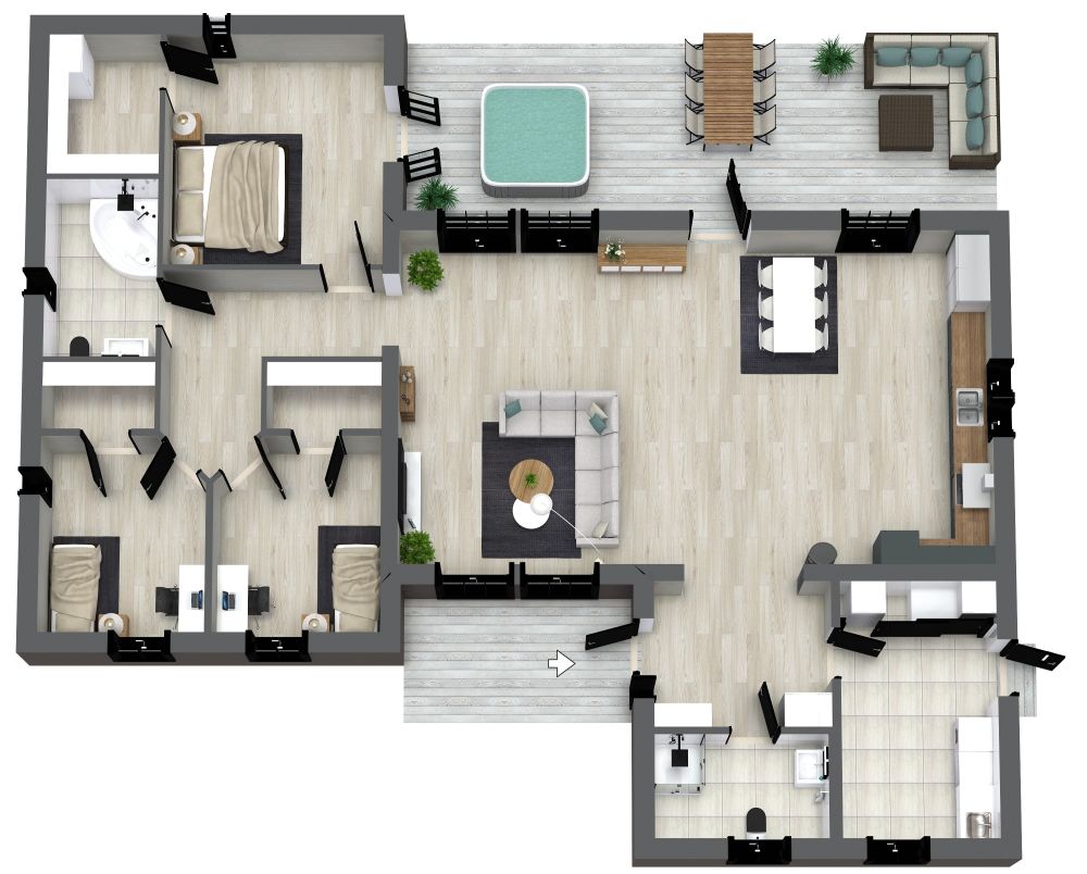 The grouped bedroom layout is one of the popular features in this Lunden 158 floor plan. A front porch leads into the entry foyer, complete with a closet, convenient ¾ bathroom, and a sizable laundry room. The expansive great room, with its L-shaped kitchen, allows for virtually unlimited furniture arrangements. Several large windows and a glass door, designed to maximize views, overlook the spacious deck and backyard. On the left side of the plan, the generous primary bedroom features a large walk-in closet and french doors to the back deck. Nearby, a shared bathroom treats you to a luxurious oversized soaking tub. Furnish the two adjacent secondary bedrooms with large built-in closets according to your needs: they could be perfect for kids, guests, a workout room, or an office.