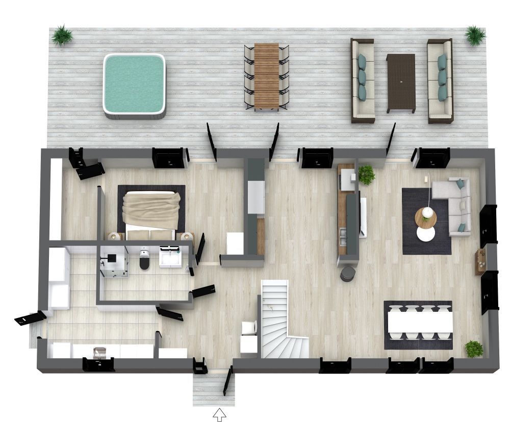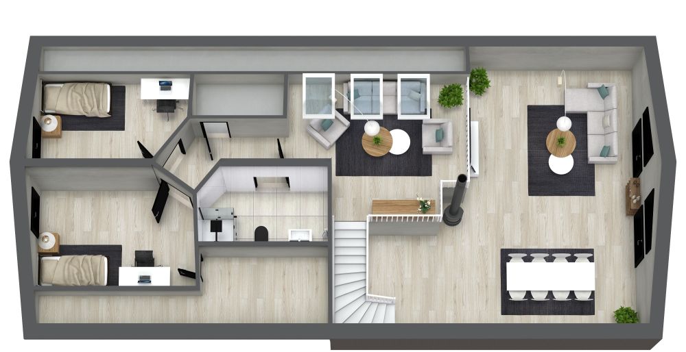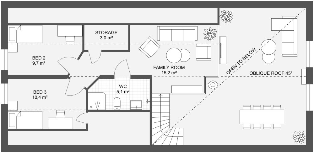 The Klippan 159 floor plan, with its primary bedroom on the ground floor, provides privacy and easy bedroom access for those who do not want to navigate stairs. The ground floor entrance foyer includes a handy drop zone area and easy access to a large laundry, mudroom, and storage area. On the right side of the plan, a light and bright open living and dining space has large windows for views in every direction. The galley kitchen includes a double sink, range, full-size refrigerator, and upper storage cabinets. Chefs will appreciate the convenient terrace access door for al-fresco dining and entertaining. The sizeable primary bedroom on this level includes access to the terrace, a large walk-in closet, and an adjacent ¾ bathroom. Upstairs, set up the open landing as a kid's playroom, teen room, or den. This level's two secondary bedrooms share a ¾ bathroom and a large storage closet.