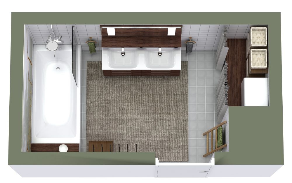 If you are a rustic-style fan, look at this rectangular bathroom with a washer/dryer. The floor plan features a swing door opening into a rectangular space with a bump-out closet for the washer/dryer at one end - a curtain hides the area when the washer/dryer isn’t in use. Bathroom fixtures include a double vanity sink and combined bathtub and shower - you can customize the layout to fit a small standalone shower and toilet if desired. Key elements of a rustic style bathroom include natural materials and treatments, and we see these in the wood vanity, shelves, stool, and ladder towel rack. A natural fiber rug adds texture to the décor, and the green towels bring in an additional touch of nature. Neutral gray floor tiles, white wall tiles, and chrome fixtures complete this rustic design.