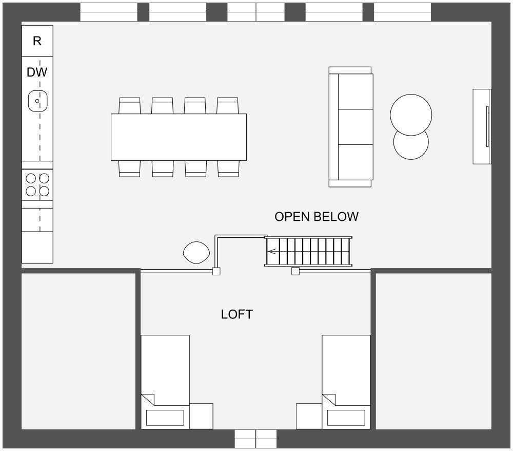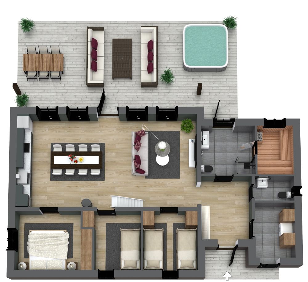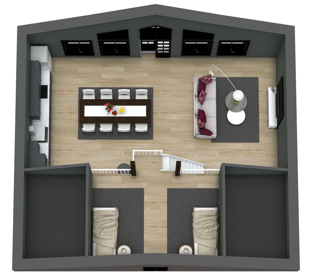 Enjoy indoor/outdoor dining and entertainment in the Harmoni 112 floor plan. The entry foyer includes handy touches like a shoe storage cabinet and powder bathroom. A sizable open concept great room can be furnished in a variety of ways; we’ve added a long dining table, perfect for family and guests. The single wall kitchen includes all standard appliances, such as a refrigerator, dishwasher, sink, range, and wall-mounted oven; large windows and a glass door provide easy access to the beautiful outdoor deck and yard. A roomy primary bedroom and 2 adjacent secondary bedrooms provide flexible sleeping arrangements on the ground level. The bedrooms share a nearby full-featured bathroom, including a sink, shower, toilet, and an inviting sauna, perfect after a day of hiking or exercise. Upstairs, a large open loft overlooks the great room. Furnish this area as a teen room, office, gym, or extra sleeping space.