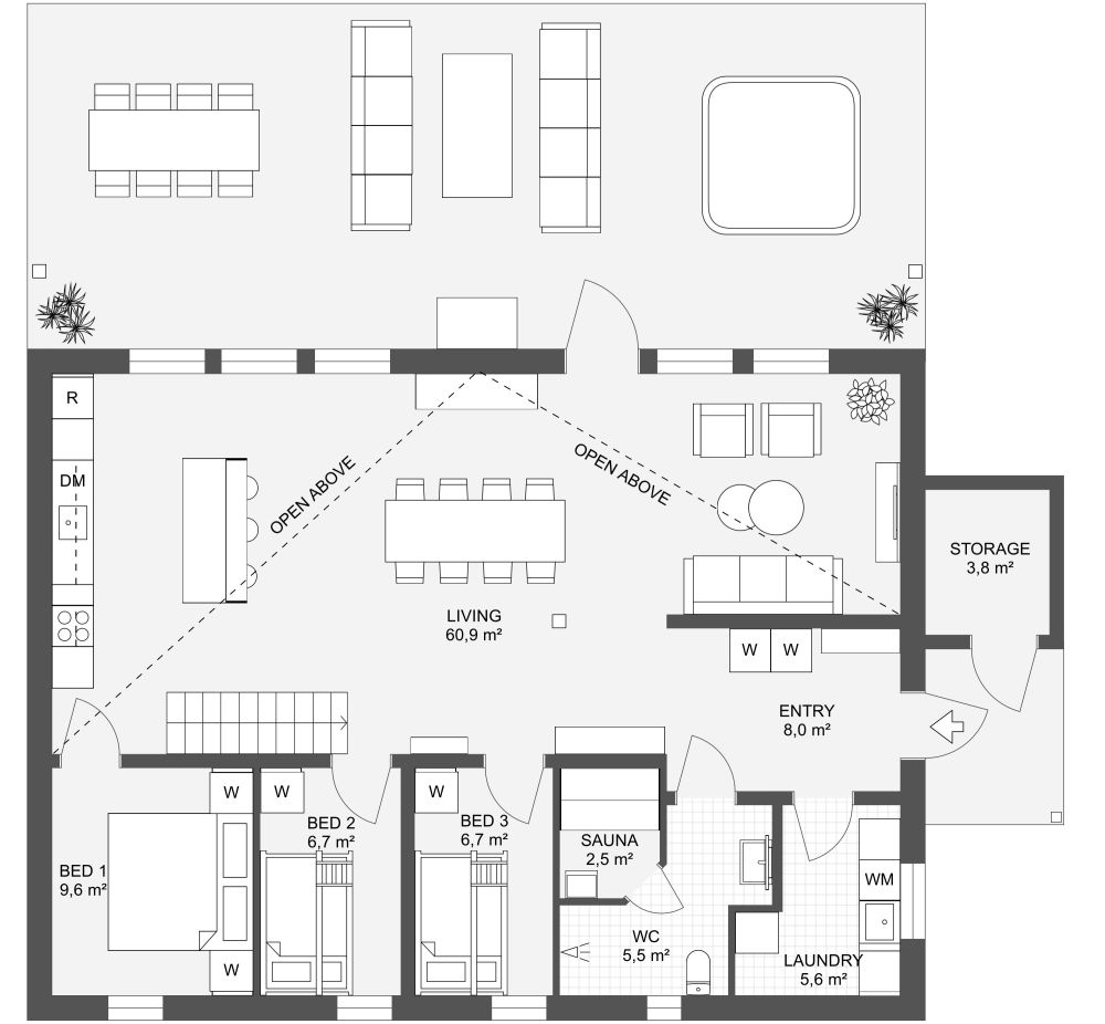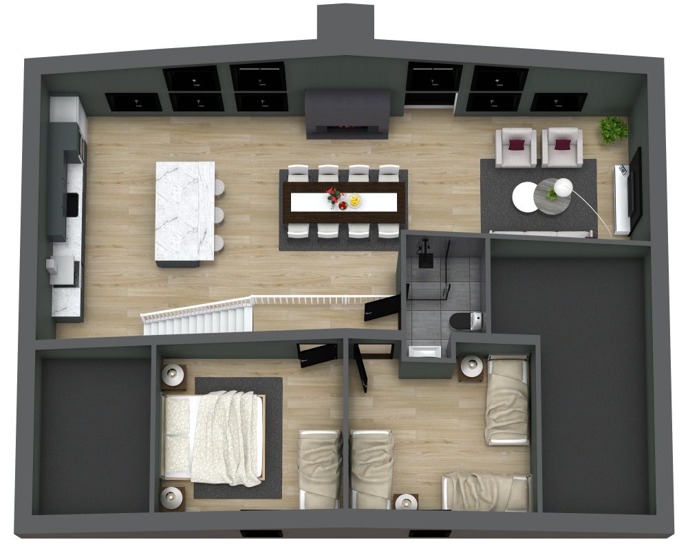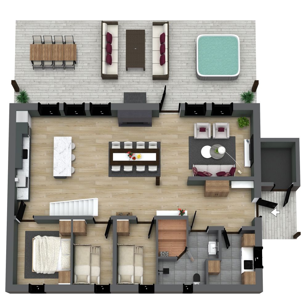 With a spacious terrace and 5 bedrooms spread over 2 levels, there’s room for everyone to spread out in the Harmoni 141 floor plan. Near the front entry porch, a convenient storage closet is perfect for storing sports gear or gardening equipment. Through the front door, a compact foyer includes a handy drop zone and easy access to a separate laundry room. The expansive living area has high ceilings, a central fireplace, large windows, and a glass door that opens onto the lovely large terrace. The single wall kitchen has room for all your favorite appliances, plus a convenient island/breakfast far for extra prep, dining, or recipe review. Three downstairs bedrooms are currently styled for a couple with kids; customize the furniture layout to your needs. The spacious downstairs bathroom includes a sink, toilet, shower, and relaxing sauna. Upstairs, a ¾ bathroom is shared by two additional bedrooms. One is currently styled for a couple, while the other is set up as a bunk room for those extra guests.