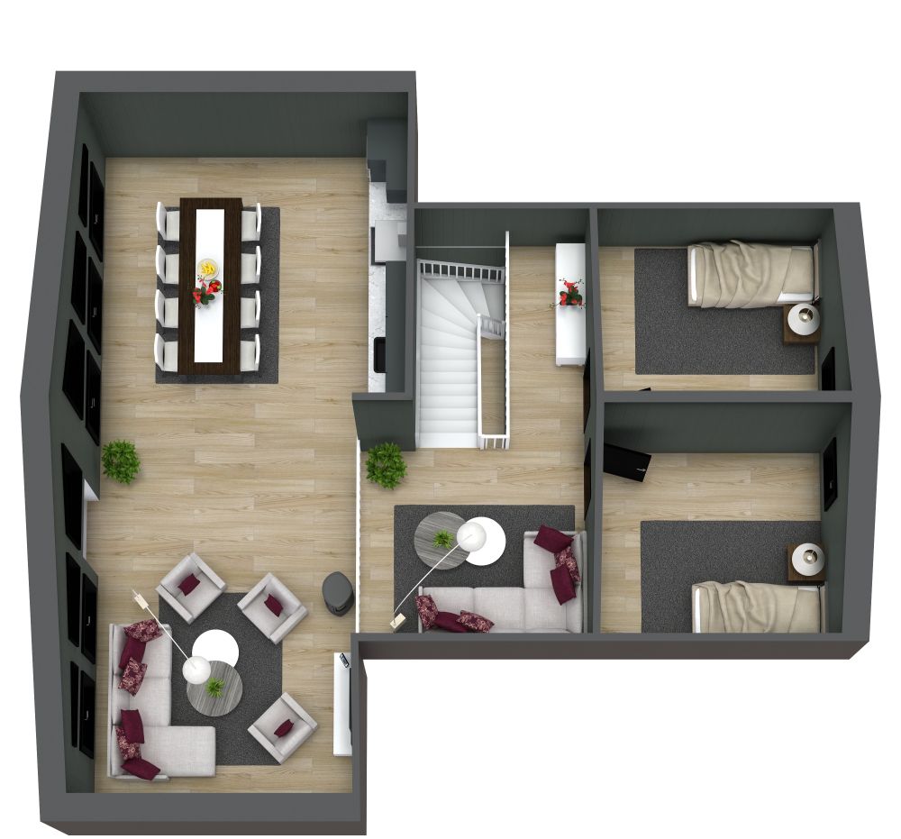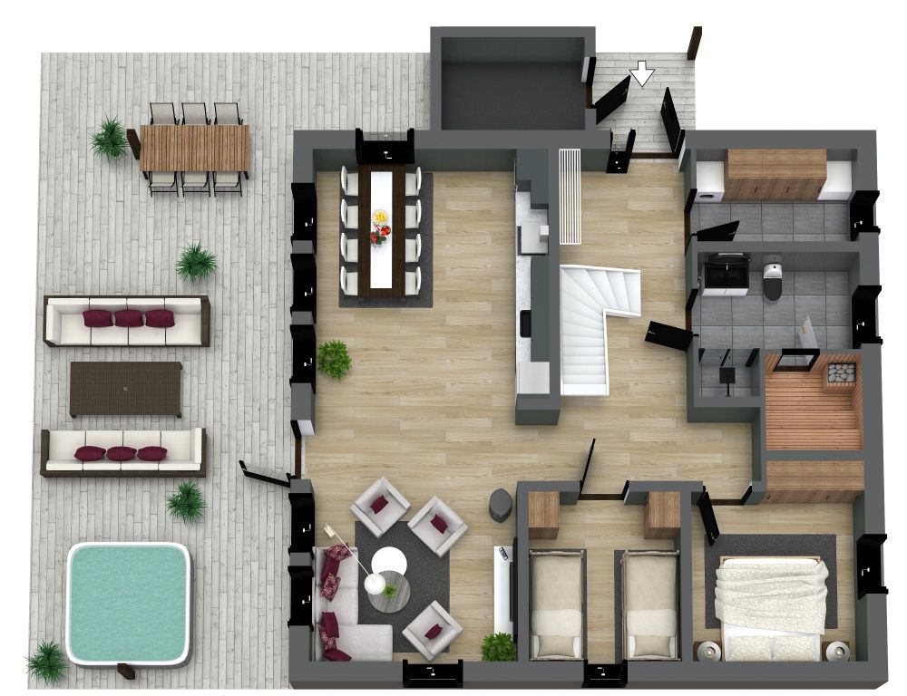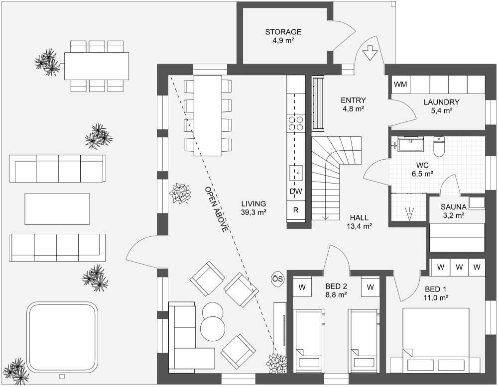With a spacious terrace and 4 bedrooms spread over 2 levels, there’s room for everyone to spread out in the Harmoni 124 floor plan. Near the front entry, a convenient storage closet is perfect for storing sports gear or gardening equipment. Through the front door, a compact foyer includes a handy drop zone and easy access to a separate laundry room. The expansive living area has high ceilings, a central fireplace, large windows, and a glass door that opens onto the lovely large terrace. Configure the single wall kitchen with all your favorite appliances, and you still have room for an expansive dining table to entertain family and friends. Two downstairs bedrooms are currently styled for a couple with kids; customize the furniture to your needs. The spacious downstairs bathroom includes a sink, toilet, shower, and relaxing sauna. Upstairs, set up the lofted area as a teen room, reading space, or second living room. Two additional upstairs bedrooms complete this layout.