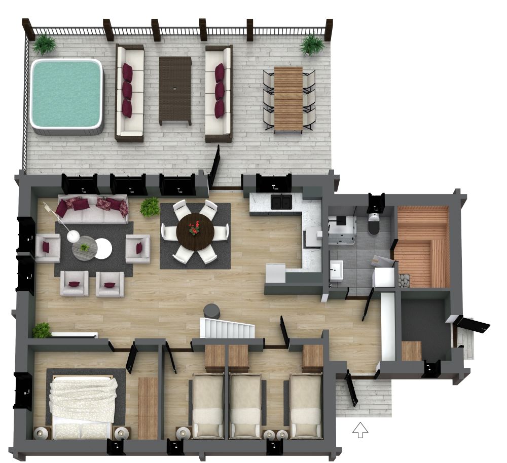 With soaring ceilings and a cool sleeping loft, the Harmoni 89 layout has plenty of room for family and guests. The main floor entry leads into an expansive open concept living space. Large windows and a glass door bring in the light and showcase views to the deck and yard beyond. A u-shaped kitchen includes a dishwasher, double sink, range, refrigerator, and handy upper cabinet storage. With easy access to the terrace, you can choose to dine in or outside under the stars. On the ground level, a large primary bedroom and 2 secondary bedrooms can be furnished in a variety of ways. The bedrooms share a nearby full-featured bathroom, including a sink, shower, toilet, washer/dryer, and an inviting sauna, perfect after a day of hiking or exercise. Upstairs, a large open loft overlooks the great room. Set up this area as a teen room, playroom, or extra sleeping space.