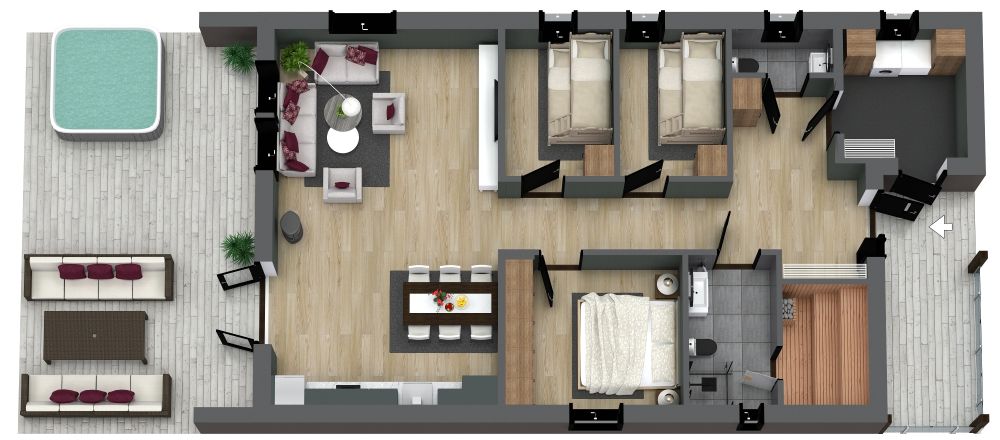 The Harmoni 100 is a stylish and functional 3 bedroom, 1.5 bathroom layout for indoor/outdoor living. One favorite feature is the direct laundry room entry right from the front porch. Sandy beachwear, muddy boots, rain gear – drop them all out of sight in your mudroom! The front foyer includes shelves, a coat closet, and a convenient ½ bathroom. Across the hall, a ¾ bathroom contains a sink, toilet, shower, and a door to a comfortable sauna. The primary bedroom has a queen or king-size bed, side tables, and lots of closet space. Configure the two smaller bedrooms as you like with single or double beds, bunk beds, or as an office or art studio. The spacious open living area includes a furniture group, a large dining table, and a single-wall kitchen. Enjoy the large windows and glass double doors which lead to a comfortable patio or deck.