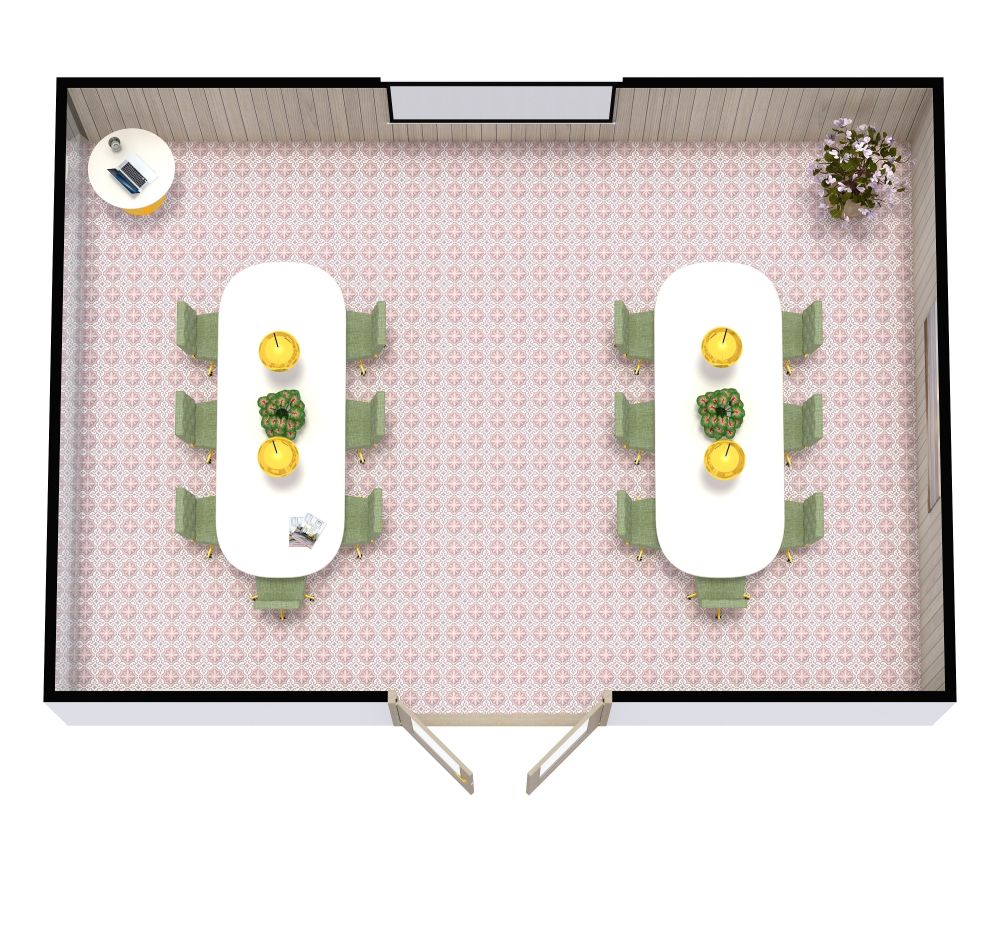 Find ingenuity and inspiration inside this creative marketing conference room plan. Soft pink patterned flooring gives this space a bright, upbeat energy, while wood-paneled walls offer insulation from outside noise. Two oblong conference tables sit in the center of the room, offering seating for up to eight people at each table. Gorgeous gold pendant lighting hangs over each table for both function and style. At the head of the room, you'll find a sliding projector screen for visual presentations during meetings, and on the side walls, dry-erase boards are available for jotting down ideas while brainstorming. A side table in the front corner of the room is the perfect spot for a speaker and their notes, and in the opposite corner, find decorative greenery that adds to the overall ambiance of the space.