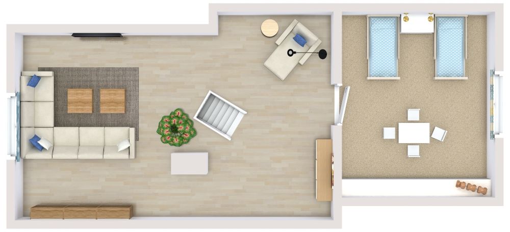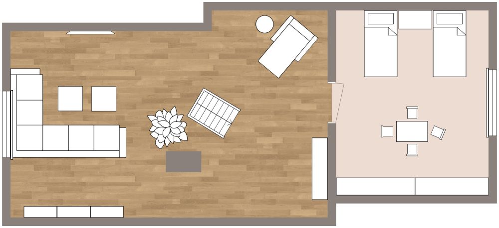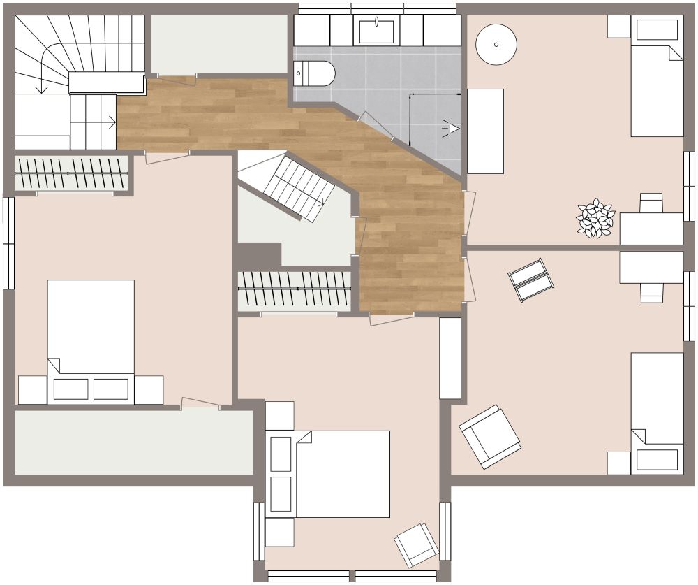 If you're thinking about multigenerational housing or you have a large family, then this 4 story 6 bedroom house plan will be perfect for you. The ground floor has a large kitchen with an L-shaped counter and island; a living area with a couch, a TV and a piano; a long room with a dining table, a couch and two armchairs; a fully-functional bathroom; and an outdoor dining table. The basement has a garage; two living areas with couches and armchairs; a bedroom with a double bed; a bathroom; a kitchen with two counters; and some outdoor seating. The first floor has two bedrooms with single beds; two bedrooms with double beds; and a bathroom with a shower, sink and toilet. The second floor has a large living area with an L-shaped couch, a TV and a chaise longue and a bedroom with two twin beds.