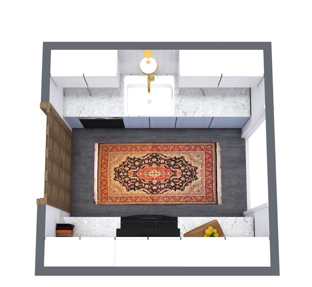 If you only have a small space for the kitchen in your home, you can still get many features by using this small galley kitchen idea. There's counter space on both sides of this kitchen, which means you have a lot of room for chopping and food preparation. There's also a cooking range with four burners on one side and a sink on the other side. There are overhead and base cabinets on both sides, which means there's plenty of storage. The cabinets are white, the counters have a white and gray marble finish and the floor is charcoal, all of which provide a neutral base for some splashes of color. You can install a paneled wood door on one side, place a Persian style carpet on the floor and install a decorative ceiling lamp. These touches give some personality to the kitchen, in addition to livening it up.