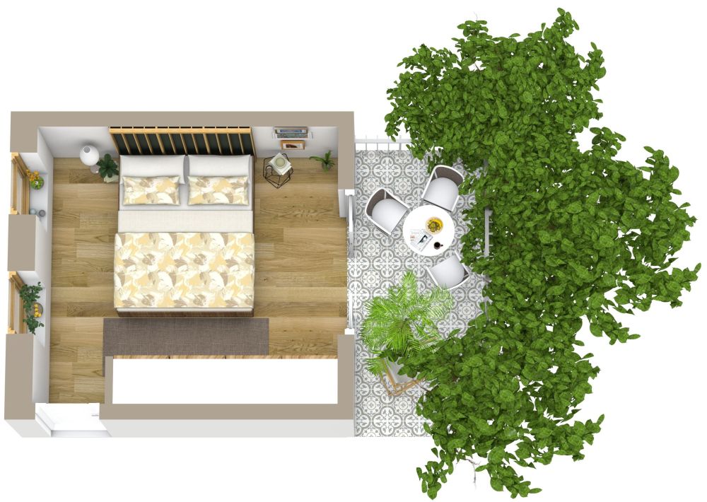 You'll feel like you're staying in a luxury resort day after day when you wake up in this small bedroom with balcony. Clean white walls paired with a sage green ceiling help make the room feel spacious and bright while warm and inviting. Natural wood floors complement the trim of the two small windows and a generous closet space that lies across from the queen-size bed. The contemporary bed frame features a floor-to-ceiling headboard with a lovely hunter green backdrop and eye-catching wooden paneling. Two sliding glass doors can be found across from the two wood paneled windows, leading out to a stunning outdoor balcony. The balcony offers flooring with gorgeous gray and white details, ample space for an outdoor table set, and lush greenery surrounding the space for much-needed privacy and color. The natural details and classic design of this bedroom help it to feel as calming as it looks.