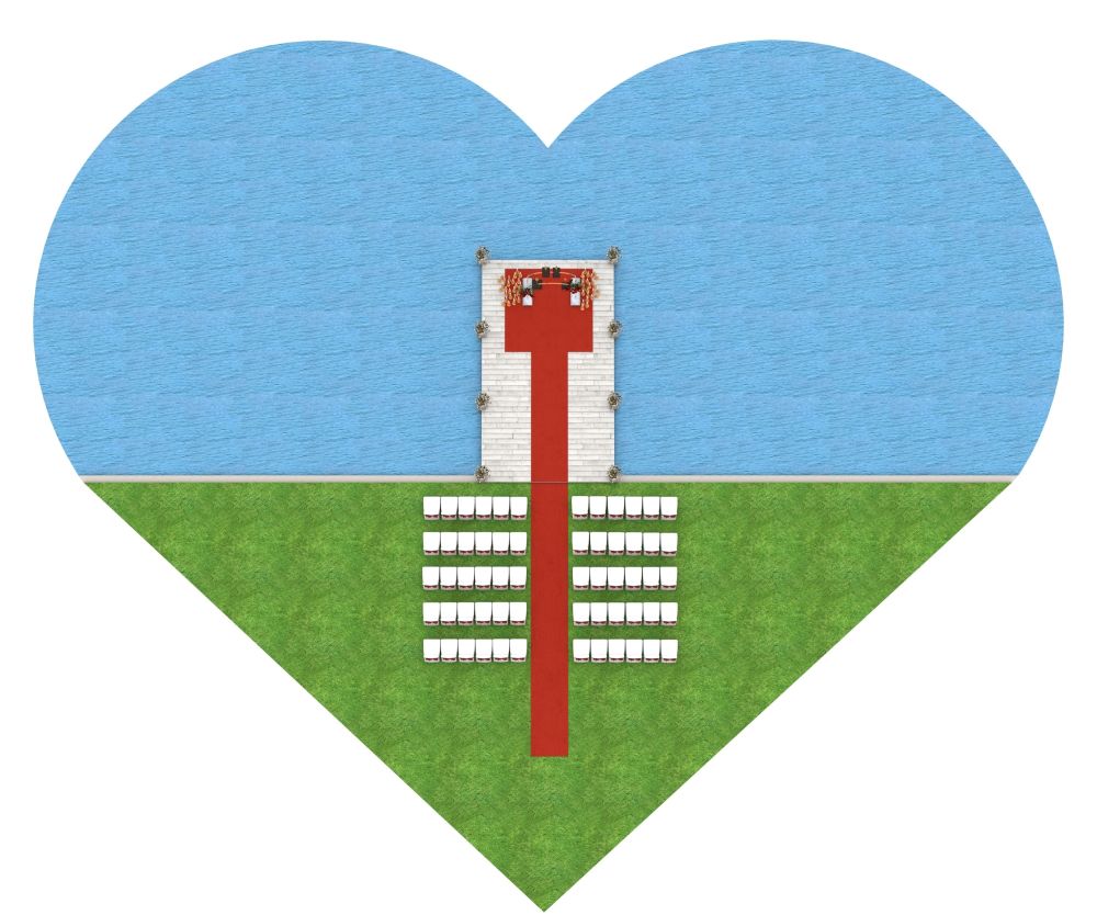 You're sure to feel love in the air at this lake side wedding venue. The heart-shaped space is broken into two areas: a large grassy space and a beautiful lake. The grassy area features sixty simple white chairs with dramatic red sashes tied around their backs. A red carpet runs through the middle of the chairs, leading to a simple wooden dock. The dock is lined with eight potted plants and has a golden archway, oversized lanterns, and an assortment of gold candlesticks at its end, where the bride and groom will stand as the focal point. The dock is surrounded by a shimmering lake, which makes for the perfect backdrop for the wedding ceremony. This outdoor space offers a romantic yet effortless vibe that your wedding guests won't soon forget.